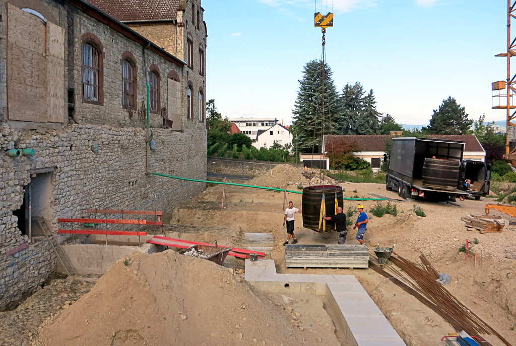 Die Einkellerung findet nun pünktlich wie geplant in der zweiten Junihälfte statt. Die Fässer gelangen über einen ehemaligen Aufzugschacht in den Keller. Von den 78 Fässern, die bis zu Beginn der Sanierung des Winzerkellers im dortigen Kellergewölbe standen, waren nur drei Stück von ihrem Erhaltungszustand her für eine weitergehende Präsentation geeignet. Diese drei Fässer wurden ebenfalls aufgearbeitet und finden nun in neuem Glanz wieder an ihren alten Bestimmungsort zurück.