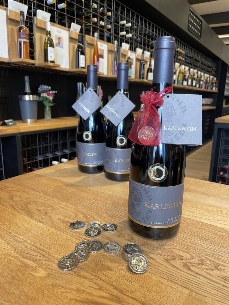 Der „Karlswein“ ist ein Gemeinschaftsprojekt von neun Ingelheimer Weingütern. Die Trauben für den trockenen Spätburgunder, Jahrgang 2018, stammen aus historischen Weinlagen rund um die Ingelheimer Kaiserpfalz, wo schon im Mittelalter Wein angebaut wurde. In der Vinothek im Winzerkeller ist der „Karlswein“ im Paket mit der „Karlsmünze“ zu haben. Bei dieser Münze handelt es sich um eine limitierte Sonderprägung der Bundesbank aus Anlass des 1275. Geburtstages von Kaiser Karl dem Großen. Das Sammlerstück ist seit März 2023 offizielles Zahlungsmittel. Die Bildseite der Münze kombiniert das persönliche Monogramm des Herrschers mit dem Oktogon des Aachener Doms, Karls einstiger Hauptresidenz.