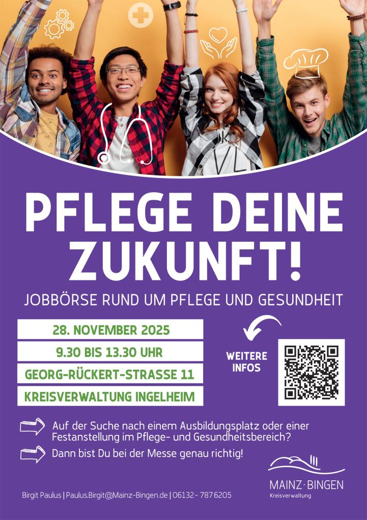 Organisiert wurde die Messe vom Arbeitgeberbüro des JobCenters und dem Integrationsbüro der Kreisverwaltung Mainz-Bingen, 2024 fand diese erstmals statt. Auch für das kommende Jahr ist das Format derzeit in Planung. Interessierte Arbeitgeber aus den Bereichen Pflege und Gesundheit können sich per E-Mail melden an Paulus.Birgit@mainz-bingen.de sowie Blessing.Linda@mainz-bingen.de oder Goethling.Janine@mainz-bingen.de.