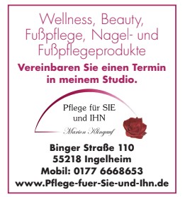 Binger Straße 110 · 55218 Ingelheim Telefon: 06132 431146 Mobil: 0177 6668653 https://www.Pflege-fuer-Sie-und-Ihn.de