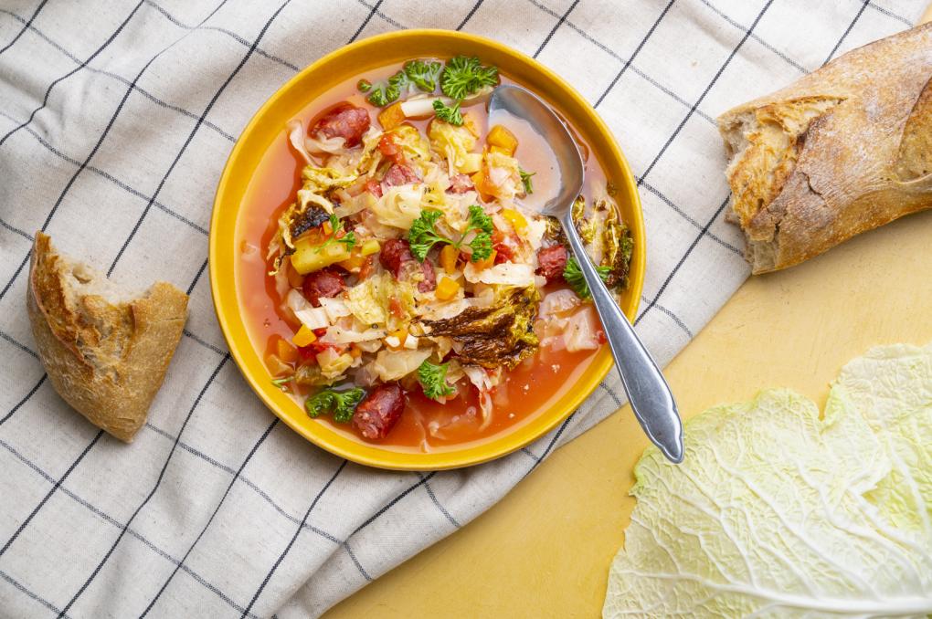Zum Schluss Wurst in Scheiben schneiden, in die Suppe geben und für 8 Minuten ziehen lassen. Petersilie hacken. Suppe auf Teller verteilen, mit Wirsing-Chips und Petersilie bestreuen und zusammen mit Baguette genießen.