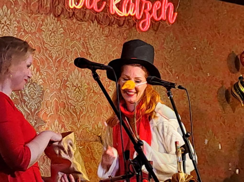 Gekonnt kokettierten die drei swingenden Stubentiger auch mit dem Frauenbild vergangener (?) Zeiten. Sei es mit den Original-Werbetexten für das Herz-Kreislauf-Tonikum „Frauengold“, das – vielleicht aufgrund seines nicht unerheblichen Alkoholgehalts – der Hausfrau zu mehr Vitalität verhelfen sollte. Oder mit Trude Herrs Bekenntnis „Ich will keine Schokolade – ich will lieber einen Mann“. Und wie es sich für ein Konzert in der Adventszeit gehört, fehlten natürlich nicht die Klassiker wie „Jingle Bells“ oder „Frosty the snowman“. Für letzteren wurde das in Rot gehaltene Vintage-Outfit flugs mit den passenden Requisiten ergänzt.