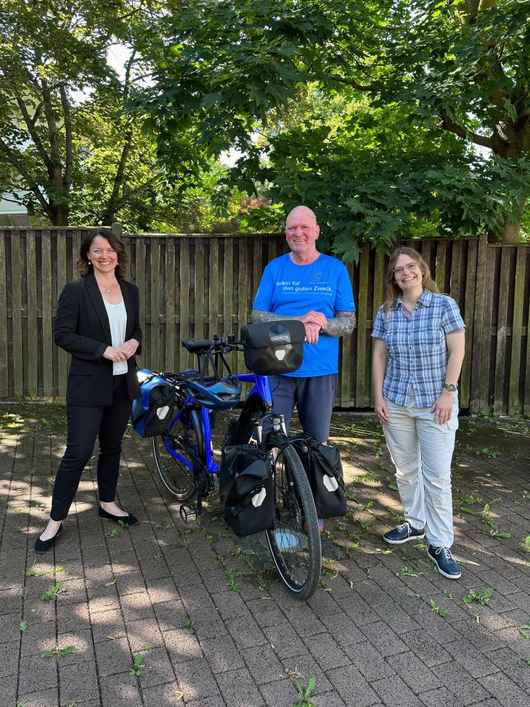 Bürgermeisterin Eveline Breyer und die Beigeordnete Dr. Christiane Döll wünschten Oliver Trelenberg im Namen der Stadt Ingelheim eine erfolgreiche Spendenaktion und allzeit sichere Fahrt. Weitere Informationen zu der Aktion und zum Werdegang Trelenbergs gibt es auf der Internetseite https://www.oli-radelt.de.