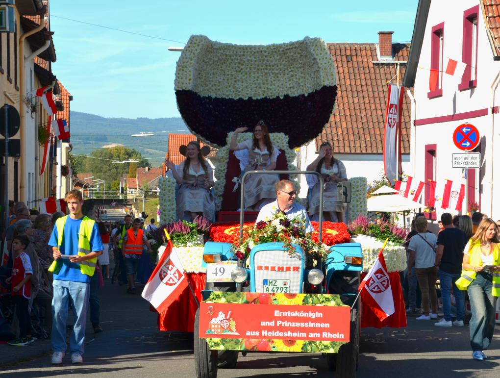 Unter diesem Motto wird in Heidesheim in diesem Jahr vom 04. bis 07. Oktober das traditionelle Erntedankfest gefeiert. Das neu gewählte Erntekönigshaus 2024/25 – Erntekönigin Madelaine I. und ihre Prinzessinnen Hannah und Leonie – wird inthronisiert und eröffnet als erste Amtshandlung das Fest.
