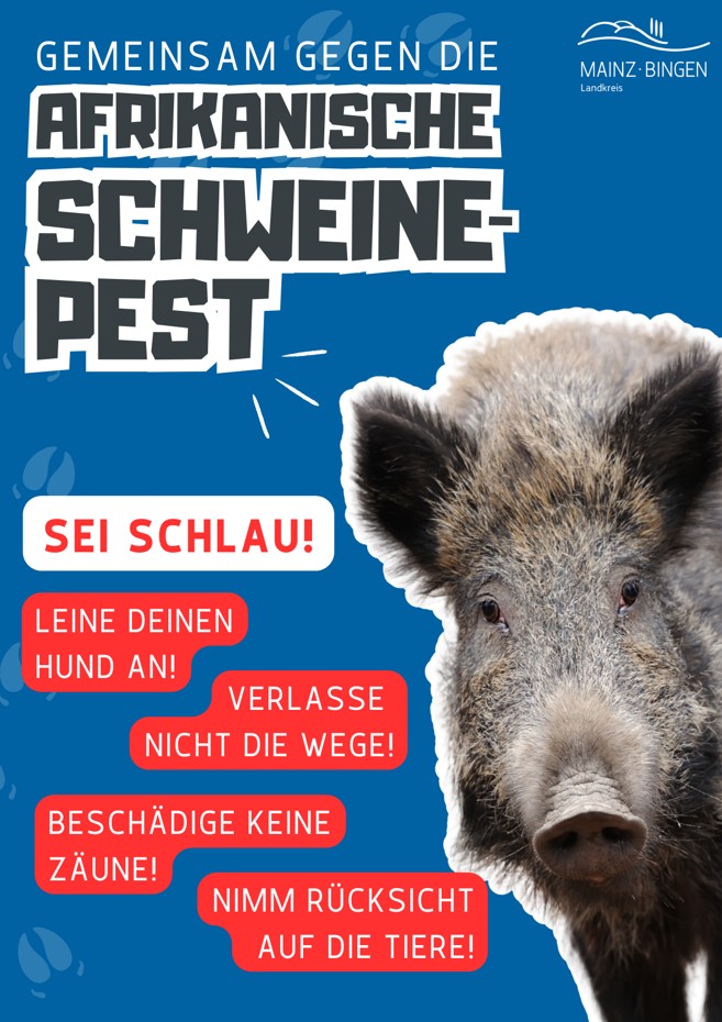 Lena, Max und Linda werden Spaziergänger künftig auf ihren Wegen rund ums Oppenheimer Wäldchen, am Rheinufer bei Nackenheim oder im Lennebergwald begleiten. Und im Netz. Mit der Plakat- und Social-Media-Kampagne „Sei schlau“ will die Kreisverwaltung Mainz-Bingen die Bevölkerung vor dem nahenden Sommer und den damit einhergehenden Aktivitäten im Freien aufrütteln, denn: Die Afrikanische Schweinepest (ASP) ist in unserer Region immer noch aktiv, Vorgaben und Einschränkungen sind weiterhin gültig, Zäune auch künftig wichtig, um das Virus im Griff zu behalten. Dies alles spiegelt sich in vier verschiedenen Plakatmotiven wieder. „Lena ist schlau – sei wie Lena. Leine Deinen Hund an“ steht da beispielsweise. Oder: „Sei wie Max. Bleib auf den Wegen.“ Bei Linda heißt es: „Beschädige keine Zäune“. Und zum Schluss widmet sich noch ein Plakat dem Thema Lärm durch Feiern im Freien.