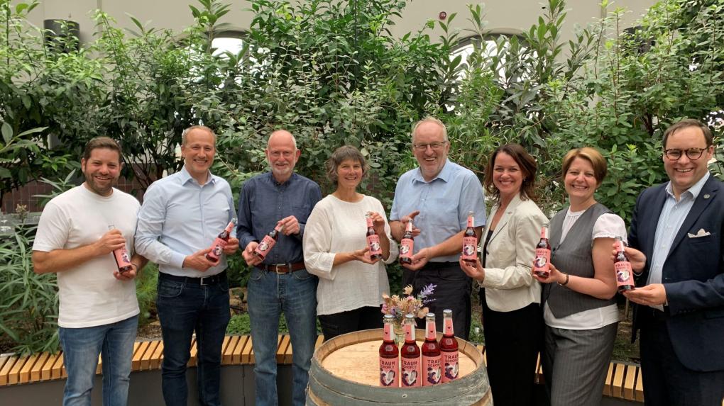 Auf dem Bild Scheckübergabe durch Andrea Freund-Kremer und Philip Schulze im Naturschutzzentrum Ingelheim – von links Hagen Graebner (NSGI), Claudia Heydt (NSGI), Wolfgang Tschuk (NSGI), Andrea Freund- Kremer (Boehringer Ingelheim), Frank Wnuck (NSGI), Philip Schulze (Boehringer Ingelheim), Heinz Dengel (NSGI)