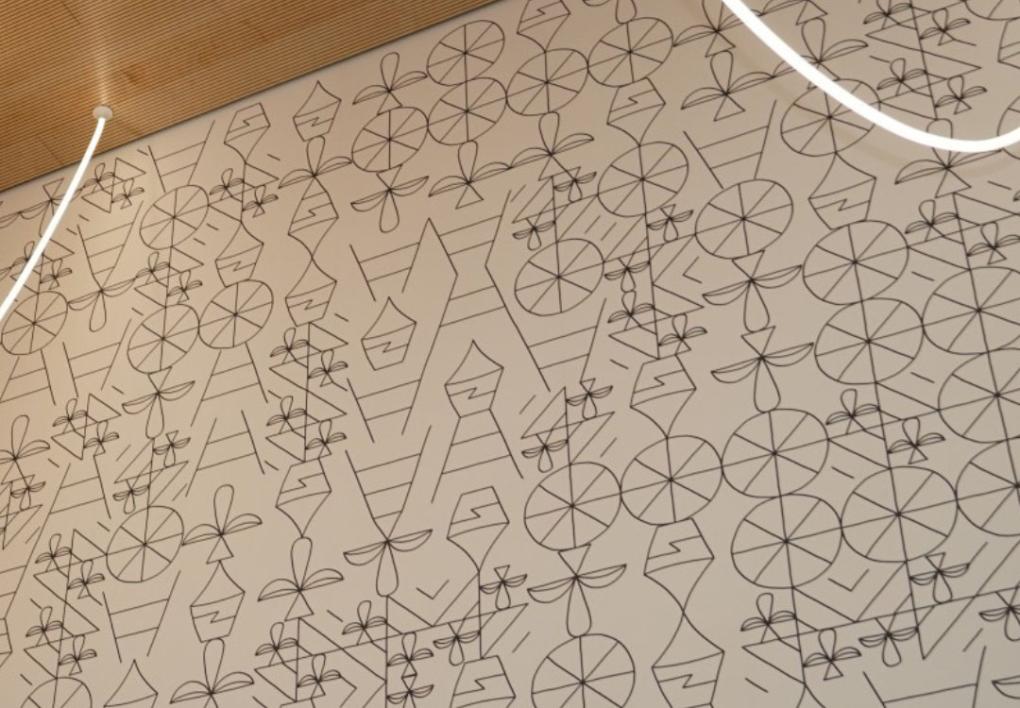 Die Anordnung der Symbole entstand mithilfe eines eigens entwickelten Computerprogramms. Anders als bei klassischen Mustertapeten wiederholt sich das Motiv nicht regelmäßig. Es gibt keinen Rapport. Jede Stelle der Wand bleibt einzigartig. Das Werk interpretiert Prinzipien der Innenraumgestaltung neu und überträgt sie in eine moderne, offene Formensprache.