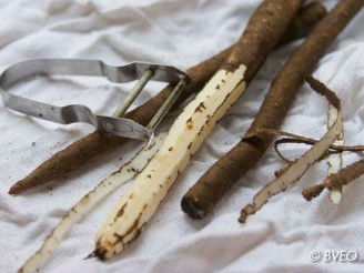 Am besten verwendet man bei dem Waschen der Wurzeln Handschuhe und trägt eine Schürze. Denn diese sind von kleinen Kanälen mit einem milchigen Saft durchzogen, der bei Luftkontakt braun wird und zu Verfärbungen an Haut und Kleidung führen kann. Deshalb die Wurzeln nach dem Putzen und Schälen sofort in Wasser mit einem Spritzer Zitrone oder Essig legen.
