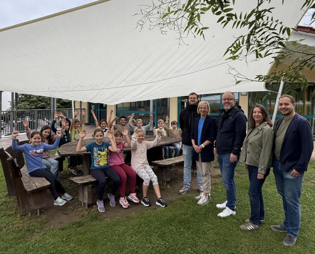 Die dritte Station der Rundreise war die Adam-Elsheimer Grundschule in Stadecken-Elsheim. Schulleiterin Christine Konrad und der Klimaschutzmanager der VG Nieder-Olm, Konrad Keßler, präsentierten hier das neue Sonnensegel auf dem Freigelände der Schule. Überdacht wird damit ein großer Holztisch mit Bänken drum herum: „Das wird hier sehr rege genutzt“, sagte die Schulleiterin. Vor allem die Ganztagskinder würden sich freuen, dass sie ihre Mittagspause draußen und im Schatten verbringen können. Gefördert wurde dieses Projekt mit rund 4400 Euro.