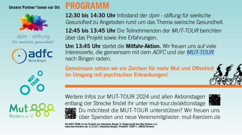 Jeder 4. von uns erkrankt mindestens einmal im Leben an einer behandlungsbedürftigen psychischen Erkrankung. Die MUT-TOUR ist ein Aktions-Programm bei dem sich bereits seit 12 Jahren Menschen mit und ohne Depressionserfahrung im Sommer durch ganz Deutschland bewegen, um sich für einen offenen Umgang mit dem Thema stark zu machen. Mit ihren persönlichen Geschichten setzen sich die Teilnehmenden für mehr Wissen und Mut im Umgang Depressionen und anderen psychischen Erkrankungen ein. Am Donnerstag, den 15. August, macht die MUT-TOUR 2024 auf dem Sebastian-Münster-Platz in Ingelheim Station. Zu diesem Anlass veranstaltet die dpm - stiftung für seelische Gesundheit von 12:30 bis 14:30 Uhr einen Aktionstag Seelische Gesundheit. Die Stiftung und die beiden Selbsthilfegruppen „Seele in Balance“ und „Sonnenstrahlen“ werden über Angebote zum Thema seelische Gesundheit in und um Ingelheim informieren. Von etwa 12:45 bis 13:45 Uhr werden die Teilnehmenden der MUT-TOUR mit ihren drei Tandems vor Ort sein. Es besteht dabei die Möglichkeit sich mit den Teilnehmenden über das Projekt und ihre Erfahrungen auszutauschen. Um 13:45 Uhr startet dann gemeinsam mit dem ADFC Mainz-Bingen die Mitfahr-Aktion nach Bingen. Die Tour ist etwa 15 km lang. Es wird ganz gemütlich geradelt, so dass jede:r mitmachen kann. Wir freuen uns auf viele Interessierte, die gemeinsam mit uns radeln. Gemeinsam setzen wir ein Zeichen für mehr Mut und Offenheit im Umgang mit psychischen Erkrankungen! Bei der Aktion entstehen keine Kosten. Für Verpflegung unterwegs ist selbst zu sorgen. Eine Anmeldung ist für unsere Planung hilfreich, aber auch spontane Mitradler sind herzlich willkommen. Wir bitten zu beachten, dass es aufgrund der Wetterlage oder anderer Verzögerungen zu abweichenden Ankunfts- oder Abfahrtszeiten kommen kann. Anmeldung zur Mitfahraktion und weitere Informationen zum Aktionstag bei Dr. Petra Maaß, dpm-stiftung (info@dpm-stiftung.de; https://www.dpm-stiftung.de). Weitere Informationen zur Mut-Tour unter https://www.mut-tour.de/einfach-dabei-sein/aktionstage.
