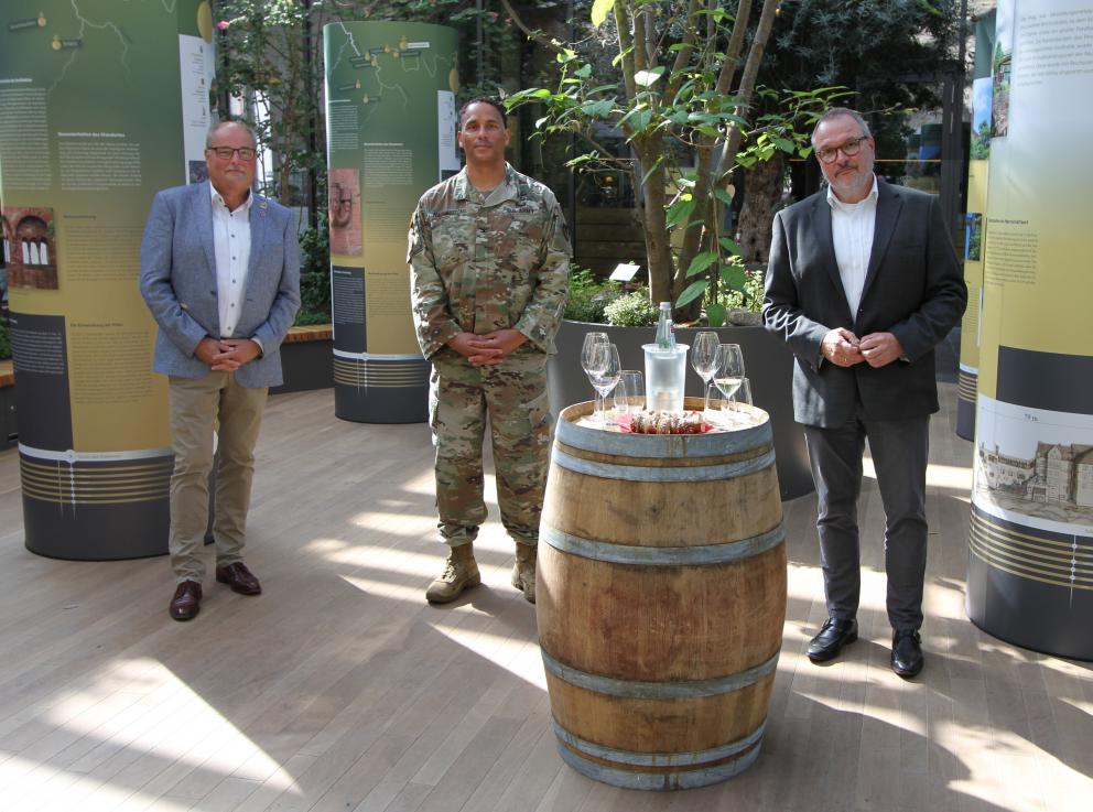 Nur für zwei Jahre können US-Commander an einem Stützpunkt bleiben, ohne Option auf Verlängerung. Und so haben die McCully Barracks in Wackernheim, die zur Zentrale in Wiesbaden-Erbenheim gehören einen neuen Chef, Commander Mario Washington, der gleich zum Antrittsbesuch zu Oberbürgermeister Ralf Claus kam. Im angenehmen Ambiente des Winzerkellers erklärte der Commander seine Aufgaben: man könne sich seine Arbeit wie die eines Bürgermeisters vorstellen, er kümmert sich um die Infrastruktur, immerhin ist er für etwa 28.000 Menschen verantwortlich. Da gehören nicht nur die militärischen Belange dazu, sondern auch Kitas, Schulen, Geschäfte oder Wohnungen der Army-Angehörigen.