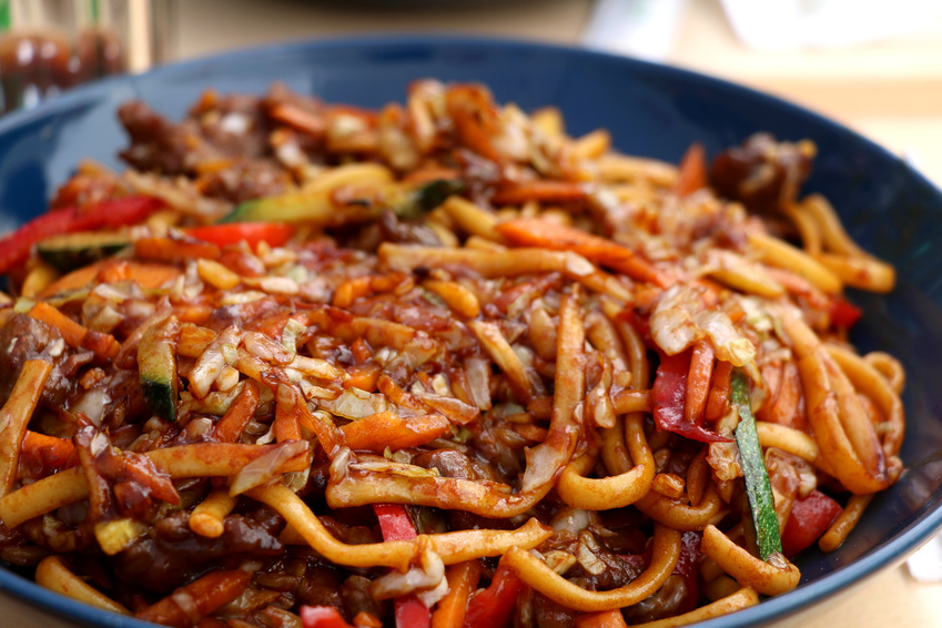 Zucchini-Karotten-Bandnudeln mit Hähnchen und Tomate