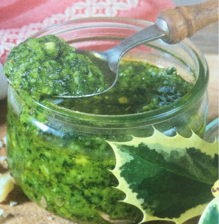 Zutaten: 12-14 gesunde Blätter der Kapuzinerkresse, 1 Handvoll Rucola ( im Garten kann man beides noch ernten), 2EL Haselnusskerne, 40g frisch geriebener Pecorino, ½ Knoblauchzehe, 6EL Olivenöl, 4 Tropfen Limettensaft, Salz und Pfeffer. Außerdem 1 Glas mit Deckel.