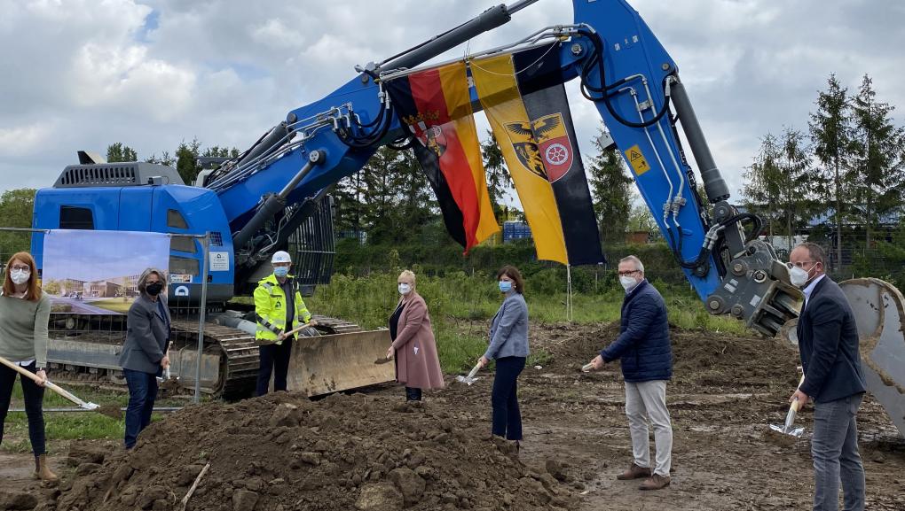 Mit dem Ersten Spatenstich hat die Kreisverwaltung Mainz-Bingen nun einen Meilenstein zum Neubau des zweiten Verwaltungsgebäudes erreicht. Bis Dezember 2022 entsteht im unteren Teil der Konrad-Adenauer-Straße in Ingelheim ein vierstöckiges Bürohaus mit 250 Arbeitsplätzen, das aber durch Teilzeitregelungen am Ende Platz für deutlich mehr Mitarbeiterinnen und Mitarbeiter bieten wird: „Dieser Schritt heute ist für uns von großer Bedeutung. Es ist nun absehbar, dass wir die Belegschaft aus dem Nieder-Olmer Kreuzhof bald wieder in Ingelheim unterbringen können“, sagte Landrätin Dorothea Schäfer, die gemeinsam mit dem 1. Kreisbeigeordneten Steffen Wolf, der Staatssekretärin aus dem rheinland-pfälzischen Innenministerium, Nicole Steingaß, und dem Ingelheimer Oberbürgermeister Ralf Claus zum Spatenstich schritt : „Die Verwaltung verändert sich ständig, wir bekommen immer weitere Aufgaben zugewiesen, unsere Belegschaft wird absehbar auf 1400 Personen anwachsen“, machte die Landrätin den Bedarf für das neue Gebäude deutlich.