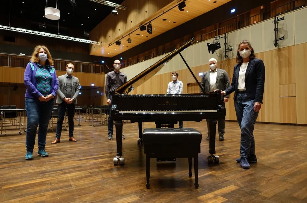 Bildunterschrift: Der Flügel hat in der kING ein neues Zuhause gefunden. Vom Verwaltungsrat St. Remigius waren dabei: Andrea Mann (l.), Stefan Weitzel (2.v.r.) und Stefan Loewen (3.v.r.) sowie Pfarrer Christian Feuerstein (3.v.l.), Kulturdezernentin Eveline Breyer (r.) und Johannes Stumpf (IKuM GmbH, 2.v.l.).