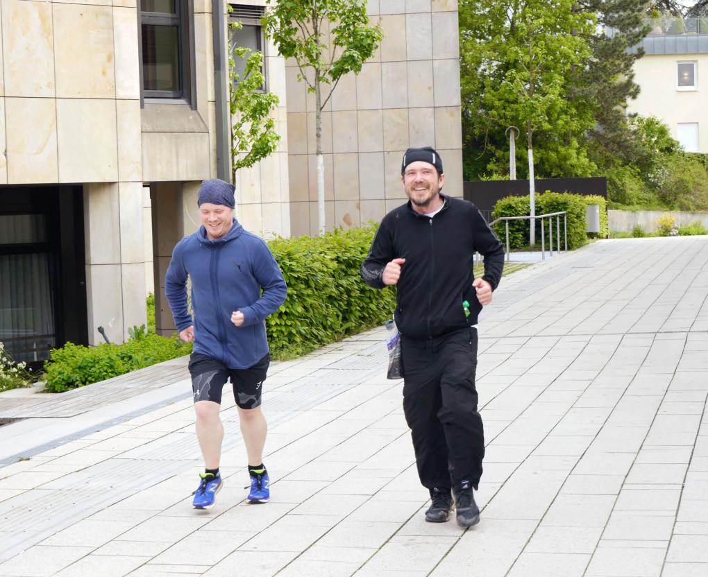 Bild: Dr. Stefan Dietrich (r.) und Christopher Börner treffen nach ihrem Halbmarathon am Rathaus in Ingelheim ein. Foto: Stadtverwaltung.