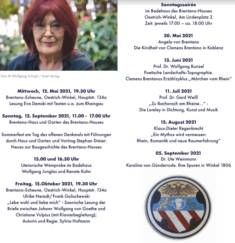 Den Anfang macht am 13. Juni Prof. Dr. Wolfgang Bunzel mit einem Vortrag zu Clemens Brentanos Erzählzyklus „Märchen vom Rhein“. Es folgt am 11. Juli ein Beitrag von Prof. Dr. Gerd Weiß zu den Wandlungen des Loreley-Motivs in Dichtung, Kunst und Musik. Am 1. August wird der im Mai ausgefallene Vortrag von Angela von Brentano zur Kindheit von Clemens Brentano in Koblenz nachgeholt. Klaus-Dieter Regenbrecht stellt am 15. August unter dem Titel „Ein Mythos wird vermessen“ die unbekannte Seite der in der Romantik entstehenden neuen Raumerfahrung vor. Schließlich wird Dr. Ute Weinmann am 5. September den Spuren von Karoline von Günderrode in Winkel nachgehen.