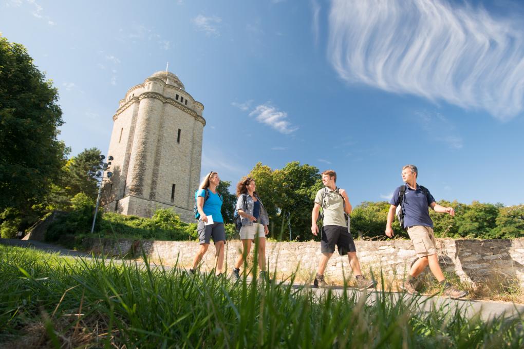 Bildquelle: "RHT-Hiwweltouren_Bismarckturm (c) Dominik Ketz" "Ingelheim Burgkirche (c) Dominik Ketz" "Ingelheim-Kaiserpfalzgelände (c)_Georg Knoll"