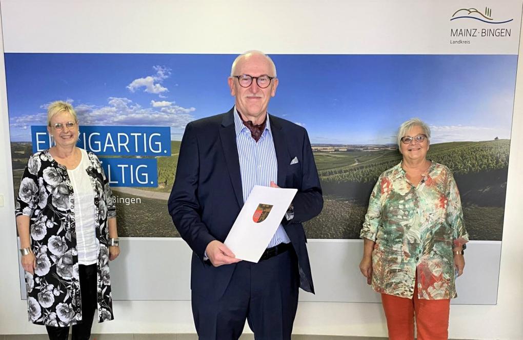 BU: Landrätin Dorothea Schäfer (links) und die Zweite Kreisbeigeordnete Ursula Hartmann-Graham (rechts) verabschieden Wolfgang Jung (Mitte) in den Ruhestand. Foto: Kreisverwaltung Mainz-Bingen/Franziska Neumann.