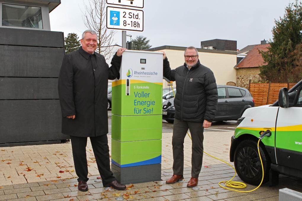 Bildquelle: Geschäftsführer der Rheinhessischen, Mike Thum (li.) und Oberbürgermeister Ralf Claus übergeben die Ladesäule der Nutzung. © Stadt Ingelheim
