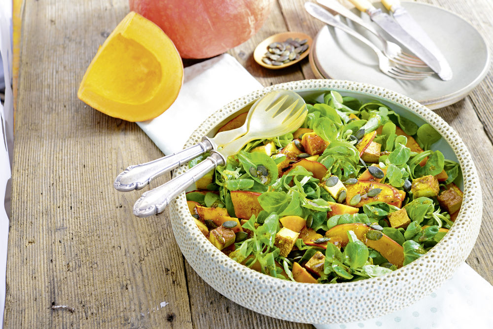 Kürbisfleisch in dünne Scheiben oder Würfel schneiden. Räuchertofu und kalte, gekochte Süßkartoffeln würfeln. Feldsalat putzen, waschen und trockenschleudern. Olivenöl in einer Pfanne erhitzen, Kürbis und Tofu darin 8 Minuten braten, leicht salzen.