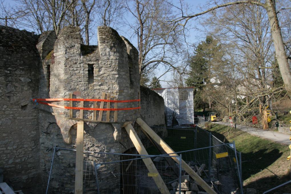 In den Turm, welcher an das Gelände der Pfadfinder grenzt, wird nach der Sanierung wieder eine kleine Hütte, auch „Holzwurmcastel“ genannt, eingebaut und kann dann wieder für die Gruppenarbeit genutzt werden. Das herausstemmen der Zementfugen und die statische Ertüchtigungen sind fast abgeschlossen. Mit steigenden Außentemperaturen kann nun mit der Verfestigung des Mauerinneren und der Neuverfugung des Bruchsteinmauerwerks begonnen werden. Die Arbeiten sollen zum Sommer 2022 abgeschlossen sein.