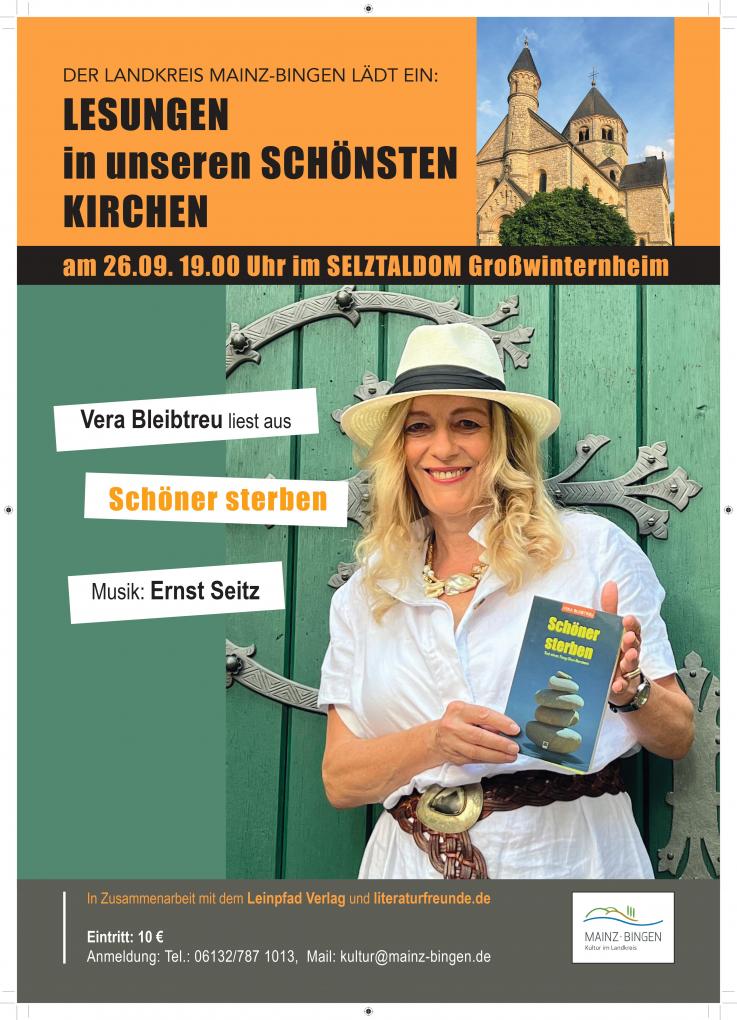 Vera Bleibtreu liest aus ihrem aktuellen Roman: Am 26. September 2022 erwartet die Bürgerinnen und Bürger unter dem Motto „Lesungen in unseren schönsten Kirchen“ ein besonderes Highlight: Das Kulturbüro des Landkreises Mainz-Bingen organisiert in Zusammenarbeit mit dem Leinpfad Verlag und literaturfreunde.de einen bunten Abend in der Evangelischen Pfarrkirche Großwinternheim, auch bekannt als Selztaldom. Das Ziel: Literarische Kostbarkeiten in der ganz besonderen Atmosphäre der Kirche erleben und genießen.