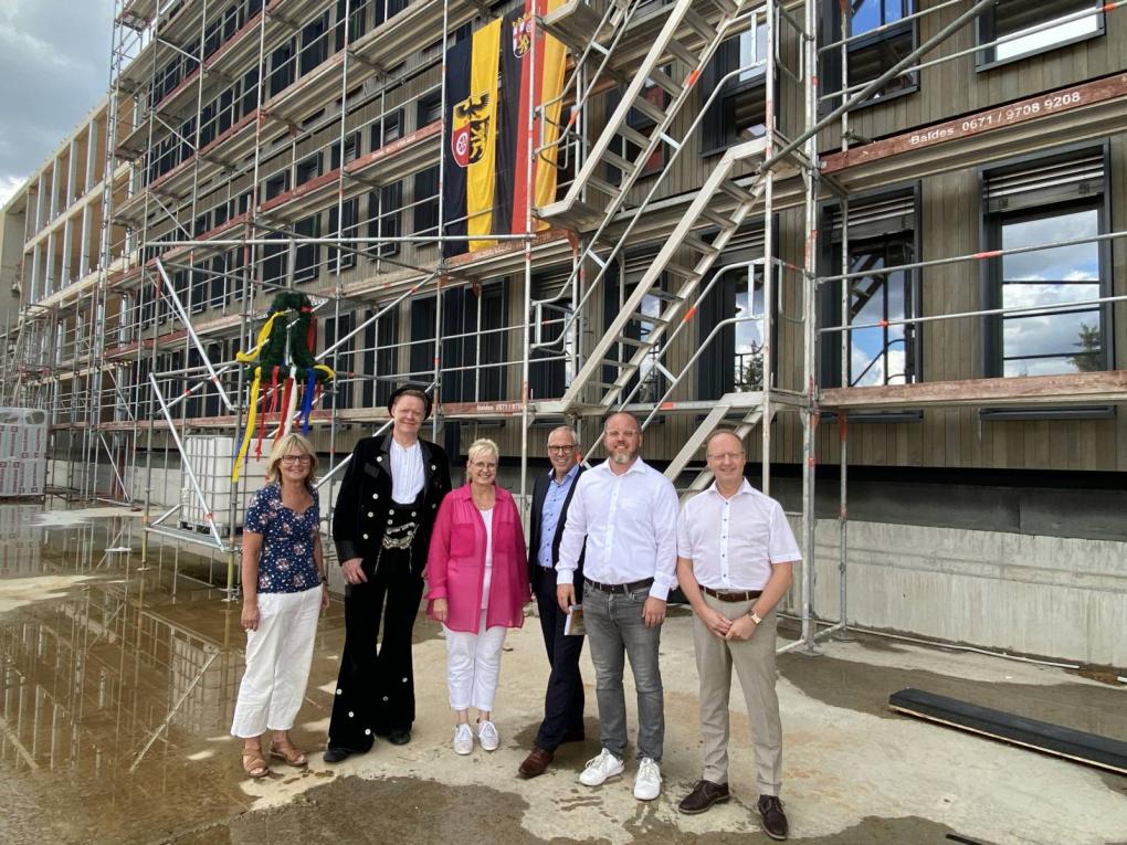 Halbzeit für den Neubau des zweiten Dienstgebäudes der Kreisverwaltung Mainz-Bingen. Inzwischen steht der viergeschossige Rohbau samt Tiefgarage an der Konrad-Adenauer-Straße in Ingelheim. Und die geschmückte Krone zeigt an: Hier wird ein Richtfest gefeiert. Der Neubau entsteht hauptsächlich in Holzbauweise und damit aus nachwachsenden und regional verfügbaren Rohstoffen. Der Kreis geht so mit gutem Beispiel für andere Verwaltungsgebäude voran. Der Bau liegt im Zeitplan, der Einzug ist im Sommer 2023 vorgesehen – bei geplanten Kosten in Höhe von 43 Millionen Euro. Nach derzeitigem Stand kann dieser Kostenplan eingehalten werden.