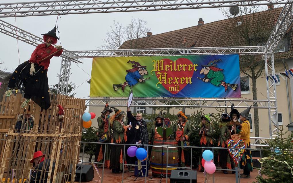 Die Hexen – unter der Leitung der Oberhexe Michaela Wald – kamen aber nicht ohne Hintergedanken: Neben zahlreichen abgeschnittenen Krawatten nahmen sie auch den Zentralchip zur Kreisverwaltung an sich. Die Landrätin wurde später in Weiler auf dem Dorfplatz fündig: Im Hexenkessel von Weiler löste Landrätin Dorothea Schäfer den Zentralchip zum Kreishaus gegen eine kleine Spende aus. „Drum bring ich Spenden gut gemeint, hab mich mit euch jetzt hier vereint, um den Chip wieder in der Hand zu halten, und euch endlich wieder zu verwalten“, scherzte Landrätin Schäfer beim Zurückfordern des Schlüssels. Die erpressten „Lösegelder“ spenden die Hexen, wie in jedem Jahr, für soziale Zwecke.