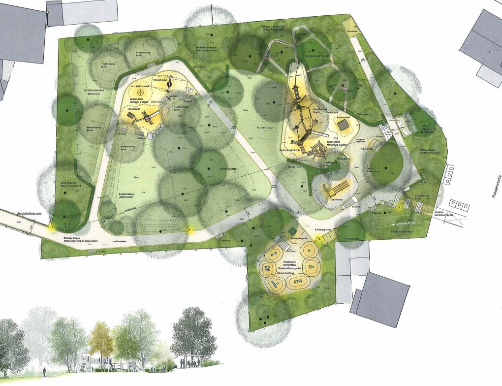 Das Gelände wird unter Beibehaltung des eingewachsenen Baumbestandes in eine attraktive Spiel- und Parklandschaft für Alt und Jung verwandelt. Für die kleineren Kinder von eins bis sechs Jahren wird es im unteren Teil des Geländes eine Spielanlage mit Rutsche, eine Nestschaukel, ein Karussell und einen Sandbagger geben. Im oberen Teil wird das Motto „Schatzinsel“ mit einer großen Spielanlage aus Robinienholz mit vielfältigen Klettermöglichkeiten und einem angrenzenden „Dschungellabyrinth“ umgesetzt. Auch für die heiß gewünschte Lauftrommel und ein Bodentrampolin wurde Platz im Gesamtkonzept gefunden. Auf Wunsch der Senior*innen werden Outdoor-Fitnessgeräte zur körperlichen Ertüchtigung angeboten. Abgerundet wird das generationsübergreifende Angebot durch eine Fitness- Calistenicsanlage, einen witterungsgeschützten Aufenthaltsbereich nahe der Rotweinstraße und einen Trinkbrunnen. Die wichtige Fußwegeverbindung zwischen Grundstraße (Zentrum) und Rotweinstraße (Friedhof, Weinberge) wird im Zuge der Neugestaltung durchgängig barrierefrei ausgebaut.
