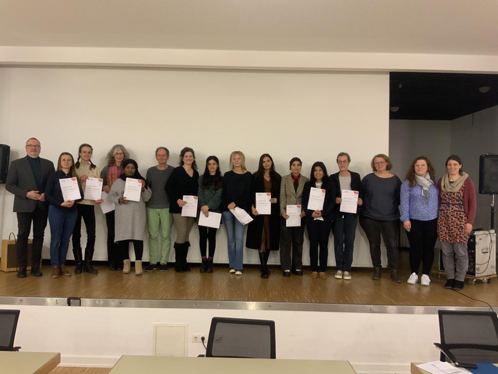 Im Anschluss an die Dankesworte kam es zum Höhepunkt des Abends. 18 neue GemeindedolmetscherInnen, die meisten von ihnen weiblich, konnten ihr Zertifikat entgegen nehmen. 18 Personen, die insgesamt 11 Sprachen abdecken und damit eine große Erleichterung im Bereich der Integration darstellen.