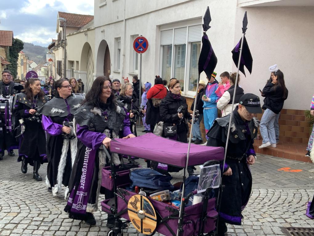 Die Guggemusiker mit scheinbar „schräger“ Musik machten den Anfang. In ihren schwarz-lila Kostümen konnte man schon glauben, dass sie dem Winter den Garaus machen. Im festlich geschmückten Mercedes Cabrio salutierte das Prinzenpaar, in eleganter Robe, wie es sich für royale Häupter schickt. Gau-Algesheim glänzte mit einem Wagen, der die Städter hinter Gittern zeigte – JVA Gau-Algesheim.