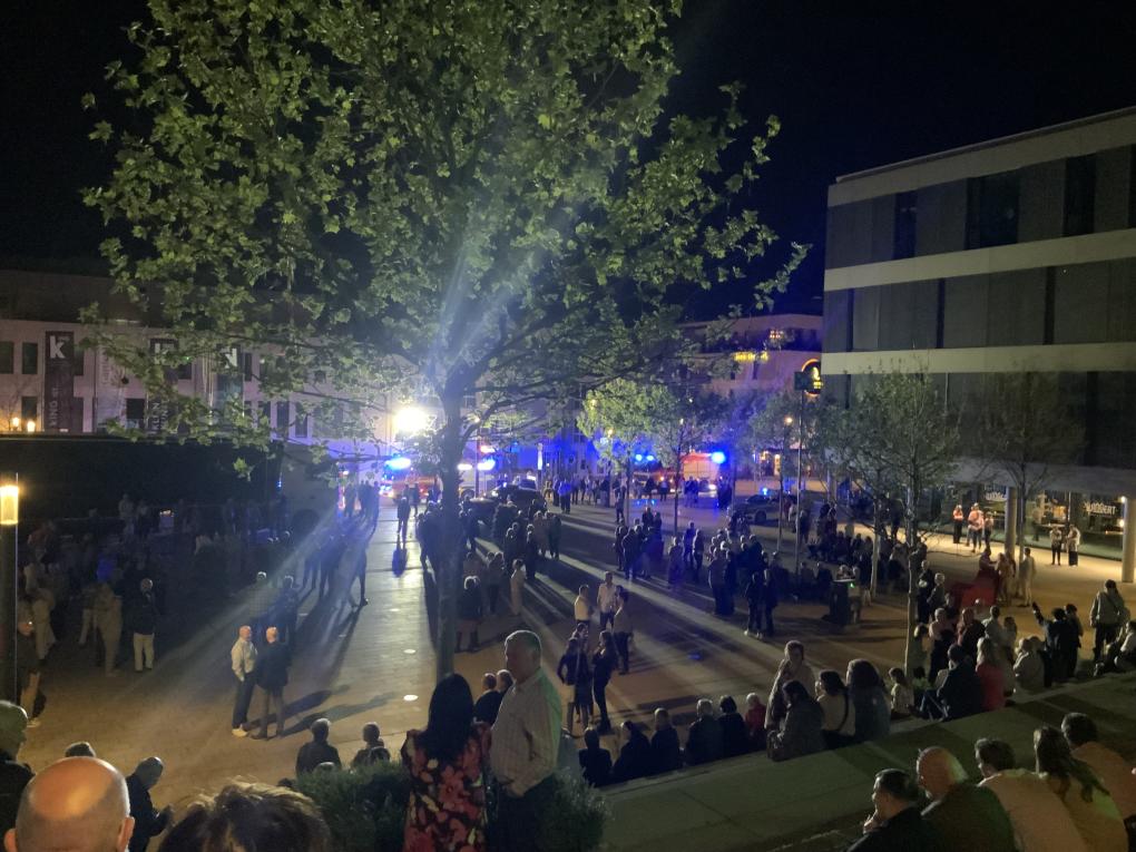 Ich versuche über Polizei und Feuerwehr zu erfahren, was die Ursache für den Alarm ist. Man berichtet mir, dass Feuerwehrleute das gesamte Gebäude überprüfen – mehr ist nicht zu erfahren. Inzwischen ist es 22.00 Uhr und einige Anwesende verlassen den Ort, weil sie nicht mehr an eine Fortsetzung der Veranstaltung glauben.