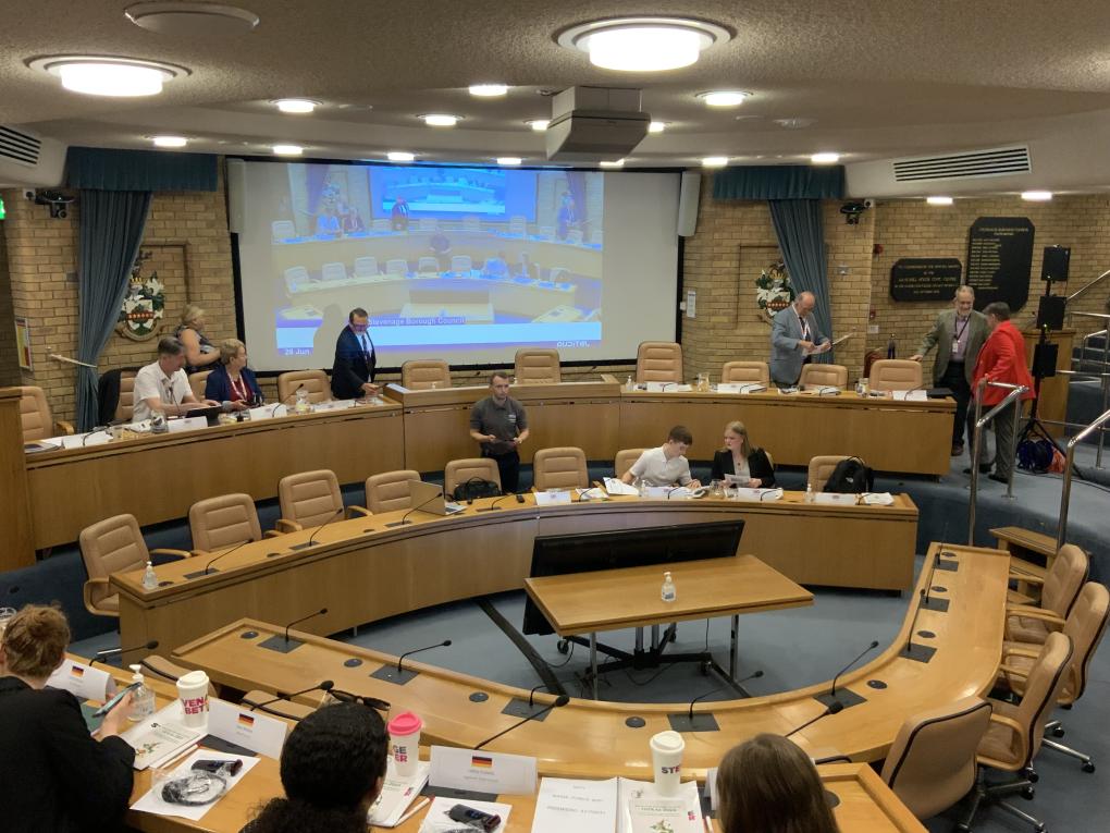 Am 2. Tag des Dreierpartnerschaftstreffen steht die Sacharbeit im Vordergrund. Richard Henry, Leader des Stevenage Borough Council, betont in seinen einführenden Worten, dass die drei Kommunen voneinander lernen wollen. Die Erfahrungen aus der Pandemie hätten in allen drei Kommunen zu großen Herausforderungen geführt, aus denen man viel gelernt habe.