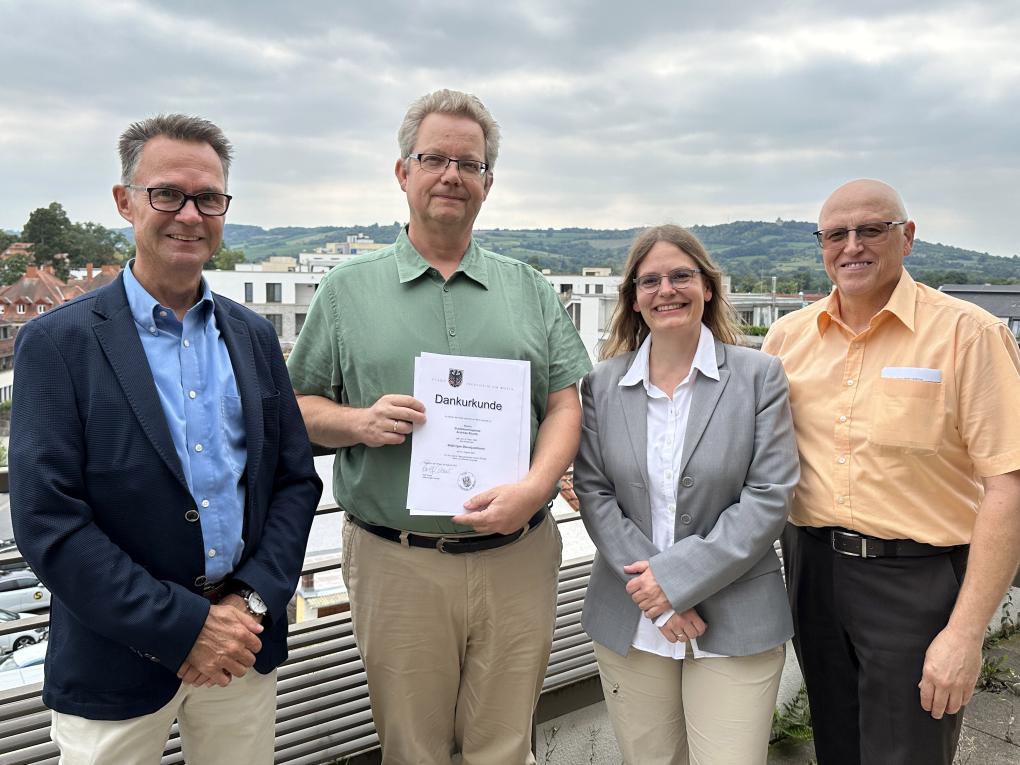 Im Rahmen einer kleinen Feierstunde überreichte Dr. Christiane Döll, als zuständige Dezernentin, Andreas Klumb neben einem kleinen Präsent die Dankurkunden des Landes Rheinland-Pfalz sowie der Stadt Ingelheim. Bernd Velten, Leiter des Ordnungs- und Standesamtes, Personalratsvorsitzender Dieter Roos, sowie Thomas Witza, Leiter der Personalabteilung, zählten ebenso zu den Gratulanten.