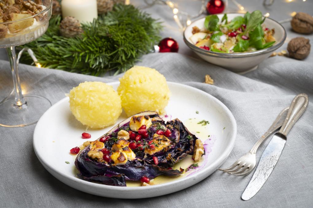 Rotkohl-Steaks zusammen mit den Klößen auf Teller geben. Mit Granatapfelkernen und Walnüssen bestreuen und genießen.