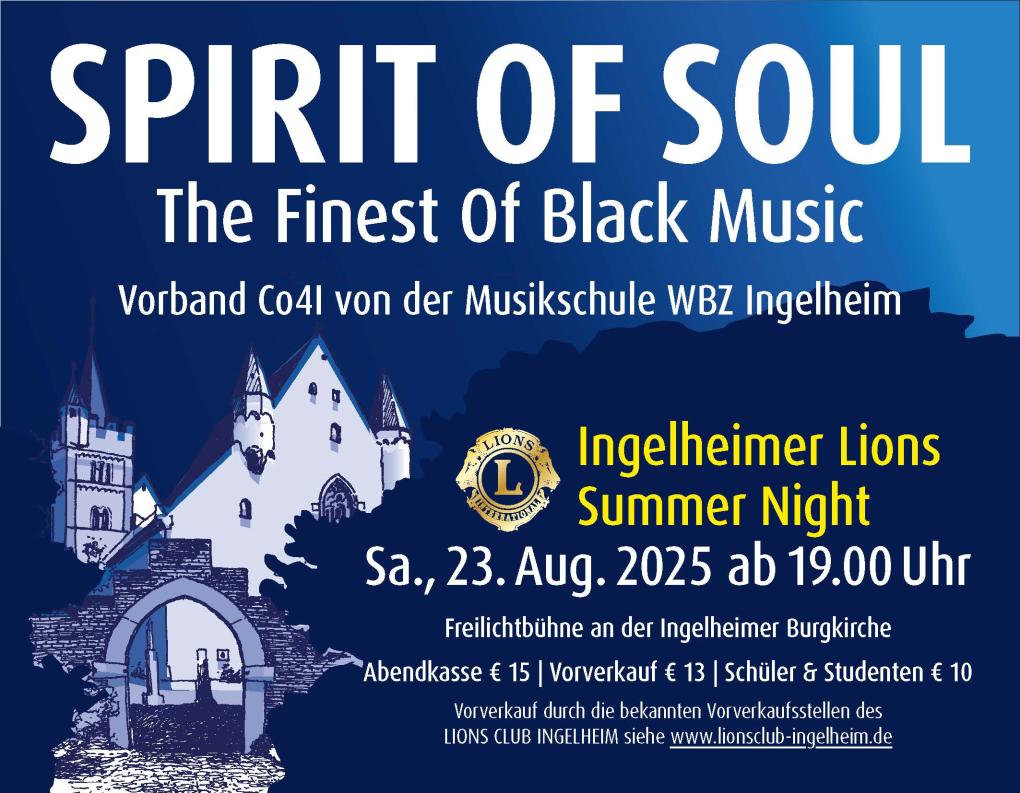 Der musikalische Abend beginnt mit der jungen Coverband „Co4l“ der Ingelheimer Musikschule. Mit der Frankfurter Band „Spirit of Soul“ folgt dann ein musikalisches Feuerwerk aus Soul, Funk und R&B – kraftvoll interpretiert und mitreißend inszeniert. Unter dem Motto "The Finest of Black Music" reicht die Programmvielfalt quer durch die großen Stars der Funk- und Soulmusik.