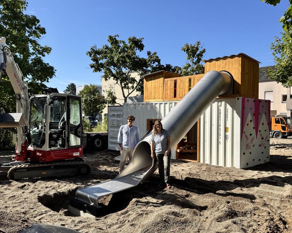 Gespannt verfolgen ein paar Kinder, wie der 6 Meter lange Spielcontainer an einem LKW-Kran hängend hereinschwebt. Fünf Wochen gab es hier eine Brachfläche, nachdem aus sicherheitstechnischen Gründen der Spielplatz „Lärchenweg“ in Ingelheim-West kurzfristig rückgebaut werden musste.