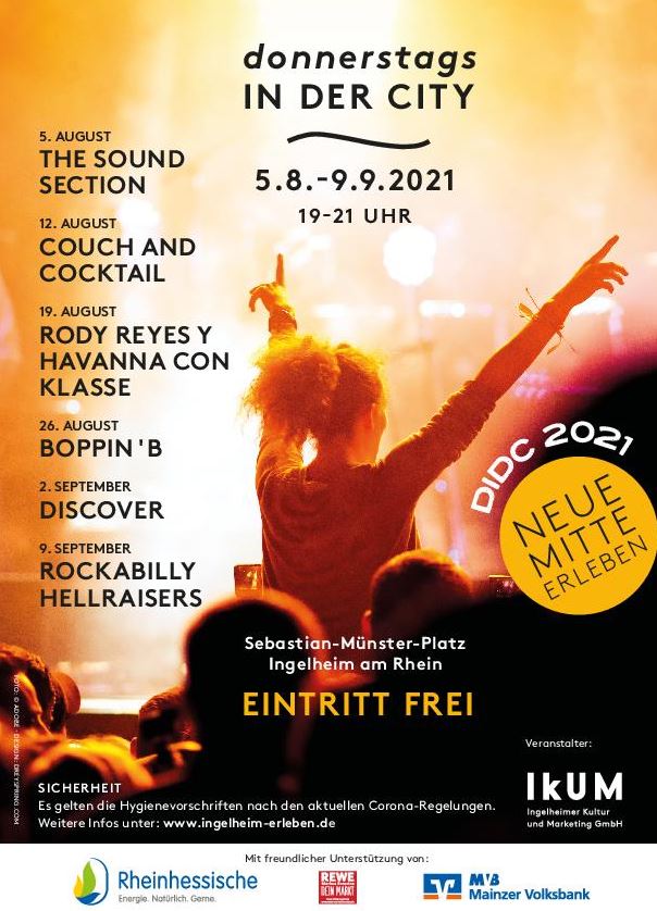 Ab August dürfen sich die Besucher wieder auf das besondere Ingelheimer Sommer-Highlight „Donnerstags in der City“ freuen. Vom 5. August bis zum 9. September wird das After-Work-Event jeden Donnerstag mit unterschiedlichen Musikhighlights aufwarten.