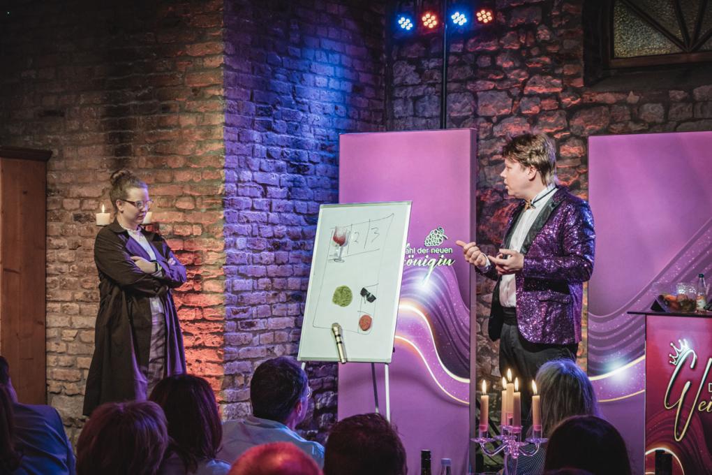 Die Wahl der neuen rheinhessischen Weinkönigin steht an! Die geladenen Gäste freuen sich auf einen fantastischen Galaabend mit allem Brimbamborium: einem gut gelaunten Moderator Vincent de Mooie, einem schmackhaften Menü, wunderschönen Kandidatinnen und natürlich großartigen Weinen.