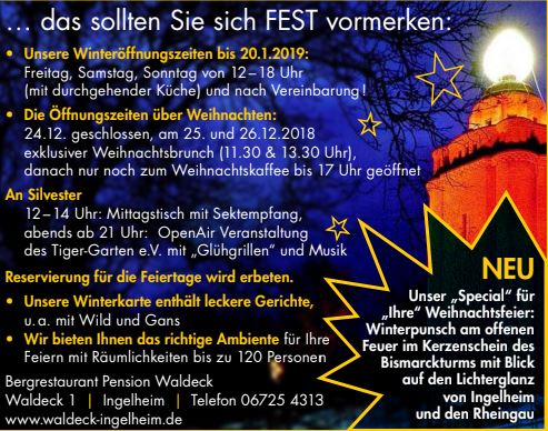 • Die Öffnungszeiten über Weihnachten: 24.12. geschlossen, • am 25. und 26.12.2018 Weihnachtsbrunch (11.30 & 13.30 Uhr), • danach nur noch zum Weihnachtskaffee bis 17 Uhr geöffnet Reservierung für die Feiertage wird erbeten.