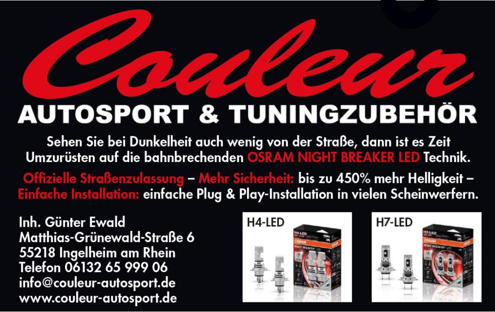 Couleur Autosport und Tuningzubehör Inh. Günter Ewald Matthias-Grünewald-Straße 6 55218 Ingelheim am Rhein Telefon 06132 65 999 06 info@couleur-autosport.de https://www.couleur-autosport.de