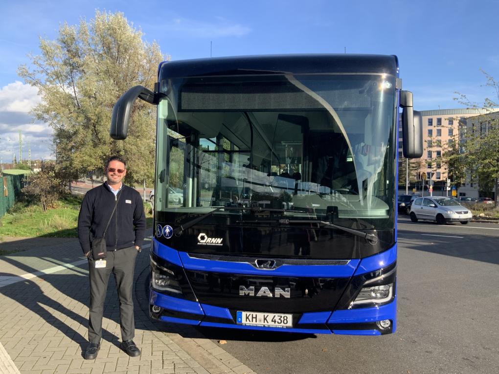 Busfahrer Drechsler ist vom neuen blauen Bus, der auf Bahnsteig C des Ingelheimer Busbahnhofes auf die Mitfahrenden wartet, begeistert. Mit von der Partie sind auch Uwe Hiltmann, Geschäftsführer der KRN (Kommunalverkehr Rhein-Nahe) und Steffen Wolf, 1. Kreisbeigeordneter des Landkreises Mainz-Bingen. Auch Kreistagsmitglieder verschiedener Fraktionen haben sich eingefunden.