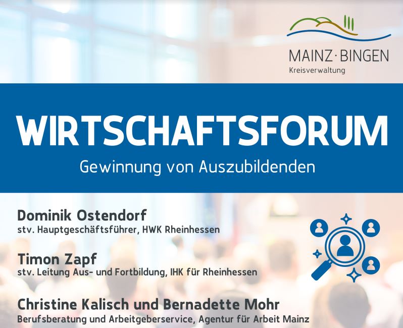Heute Azubi, morgen Fachkraft: Wer als Unternehmen gute Ausbildungsmöglichkeiten bietet, sichert sich die Fachkräfte von morgen. Doch vielerorts fehlen Auszubildende – Stellen bleiben teilweise unbesetzt. Wie also können Unternehmen gezielt motivierte Nachwuchskräfte gewinnen? Darum dreht sich alles beim Wirtschaftsforum des Landkreises Mainz-Bingen am Montag, den 10. Juni um 17 Uhr im Ingelheimer Kreishaus, Georg-Rückert-Straße 11.