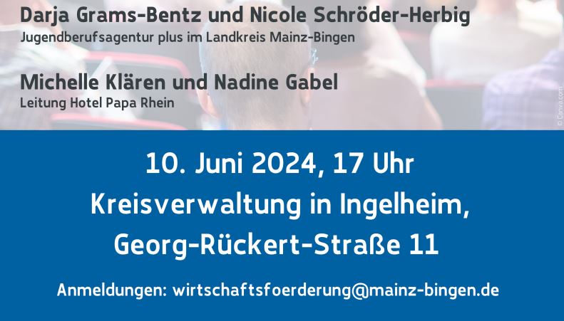 Auf die Teilnehmenden warten interessante Vorträge und Impulse zum Thema Gewinnung von Auszubildenden. Als Referentinnen und Referenten vor Ort dabei sind Dominik Ostendorf von der Handwerkskammer Rheinhessen, Timon Zapf von der Industrie- und Handelskammer für Rheinhessen sowie Christine Kalisch und Bernadette Mohr von der Agentur für Arbeit Mainz. Seitens des Landkreises stellen Darja Grams-Bentz und Nicole Schröder-Herbig ihre Arbeit in der Jugendberufsagentur plus vor. Michelle Klären und Nadine Gabel vom „Hotel „Papa Rhein“ in Bingen berichten darüber hinaus von ihren direkten Erfahrungen aus der Praxis.