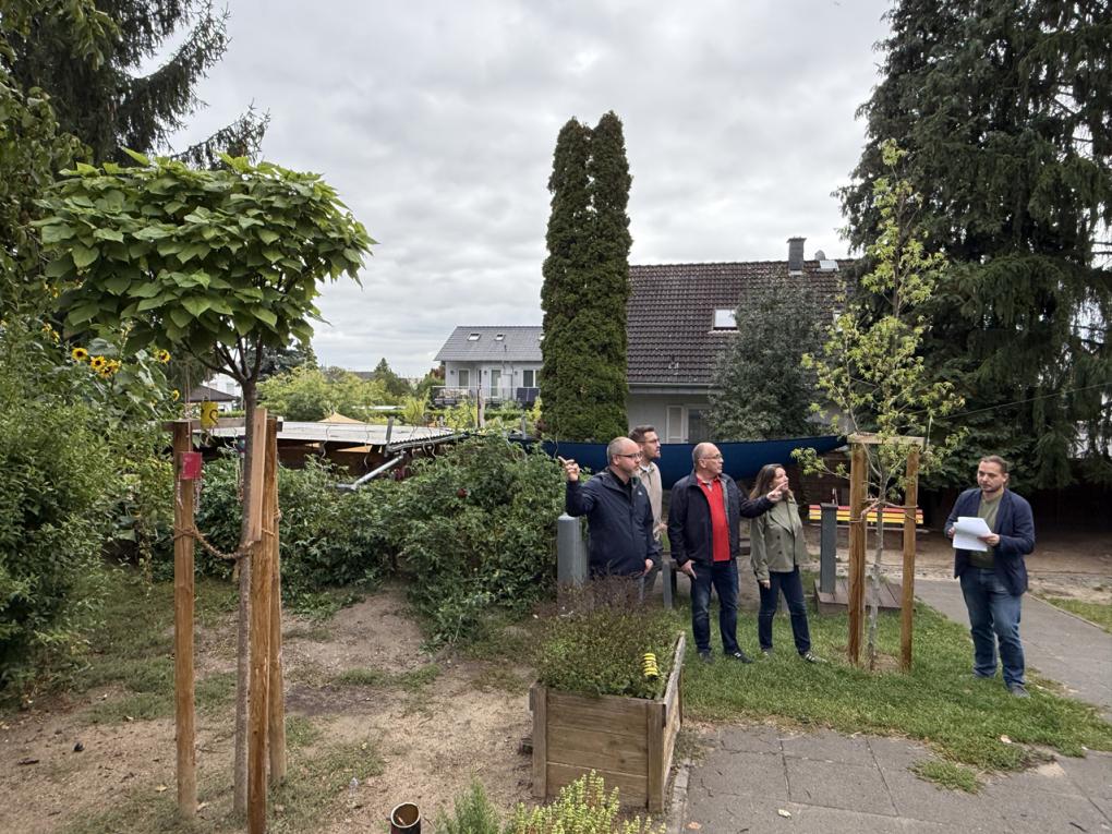 Der Erste Beigeordnete des Landkreises war in Mainz-Bingen unterwegs und besichtigte gemeinsam mit Hilmar Holland und Nadja Kaufmann vom Umwelt- und Energieberatungszentrum (UEBZ) des Kreises einige Projekte zur Klimaanapassung. Mit rund 300.000 Euro fördert der Landkreis im Programm „Bäume und Schatten statt Beton und Hitze“ solche Projekte in knapp 70 Schulen und Kindertagesstätten des Landkreises. Das Geld stammt aus dem „Kommunalen Investitionsprogramm Klimaschutz und Innovation“ (KipKi) des Landes Rheinland-Pfalz. Mainz-Bingen stehen hier insgesamt 3,1 Millionen Euro zur Verfügung.