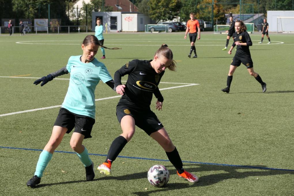 Von Beginn an übernahmen der FFV die Spielkontrolle und setzte die sehr tief stehenden Gegnerinnen, die über 90 Minuten gut kämpften und auf Torverhinderung aus waren, durchgehend unter Druck. Das führte zu einer Fülle von Einschussmöglichkeiten, Eckstößen und Torabschlüssen. Diese wurden vor dem Seitenwechsel allerdings alle nicht in Tore umgemünzt, wobei Mika Müller-Haeseler (5.), Julia Welsch (8.) und Emilia Weber (12., 42.) selbst hundertprozentige Gelegenheiten ausließen. Auch Finja Rauprich (22., 32., 44.) und Ermert (41.) hatten mit gefährlichen Torabschlüssen keinen Erfolg. Da die FFV-Mädels defensiv überhaupt nichts zuließen, ging es mit einem für die SG sehr schmeichelhaften, aber gut erkämpften 0:0 in die Pause.