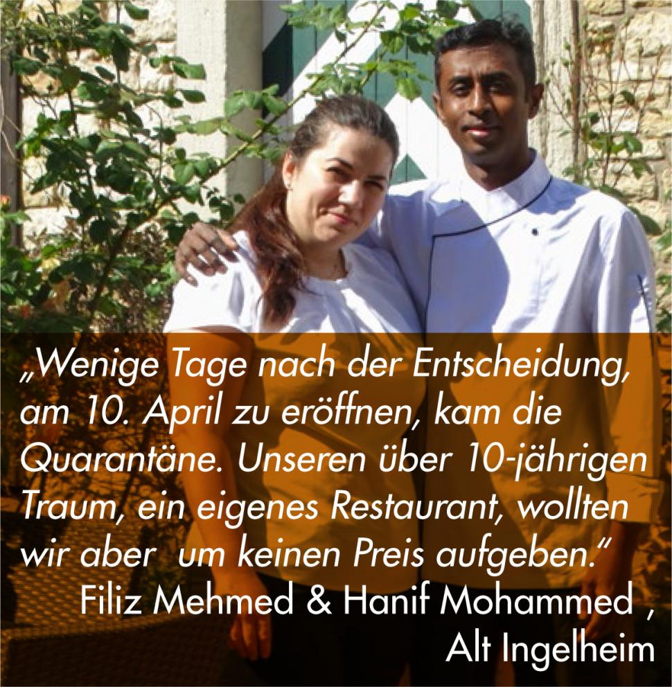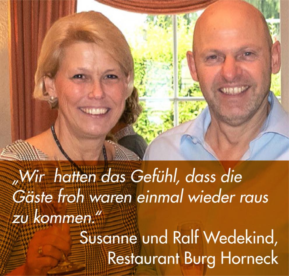 Susanne Wedekind, Burg Horneck dazu: „Jeder hatte Verständnis für die Situation und die Auflagen, die anstandslos akzeptiert wurden, und so kam kein Gast ohne Mundschutz. Ich hatte das Gefühl, dass die Gäste froh waren einmal wieder raus zu kommen und essen gehen zu können.“