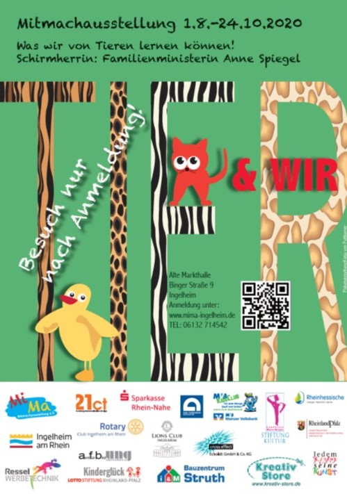Eine Mitmachausstellung in Corona-Zeiten? Lange war für den Verein klar, das klappt nicht. Dann verschob das Team das eigentlich geplante Thema ins Jahr 2021 und dachte unter der Regie von Katja von Puttkamer völlig neu. So entstand „TIER & WIR“, eine MiMa „Made in Ingelheim“. Sie verwandelt die Alte Markthalle in ein riesiges Atelier und lädt mit Augenzwinkern und Spaß zum Spielen, Rätseln, Kleben, Schneiden, Fühlen, Überlegen und Ausprobieren ein. Im Spannungsfeld zwischen unserer Corona bedingten Realität, der immer weiter wachsenden Digitalisierung, der Entfremdung des Menschen von der Natur und gleichzeitiger Sehnsucht nach unberührter Natur, richtet die MiMa den Blick mit Spots auf die Tierwelt. Dabei sind Besucher eingeladen, den riesigen Natur Tier-Natur-Landschafts-Sehnsuchts-Park mitzubauen. Und natürlich wird auch das Virus thematisiert.