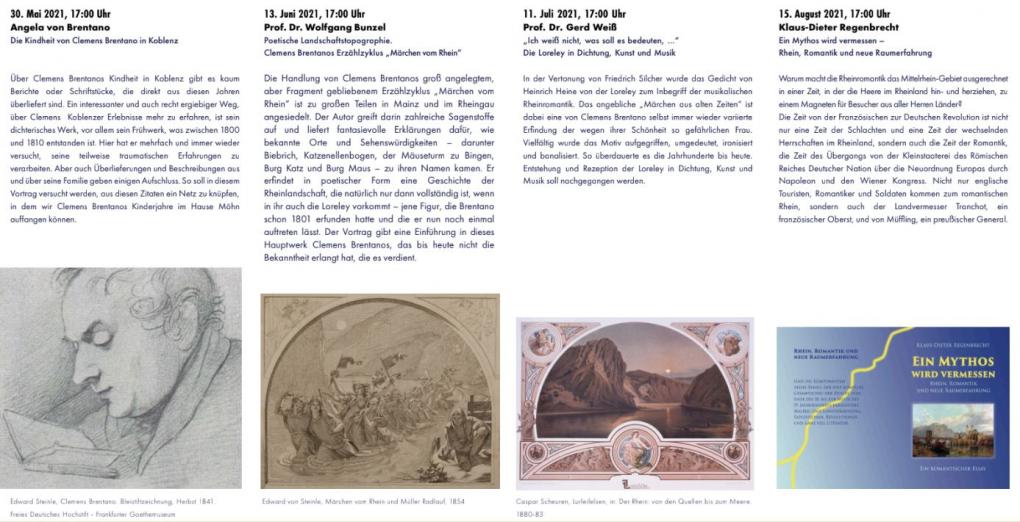 Den Anfang macht am 13. Juni Prof. Dr. Wolfgang Bunzel mit einem Vortrag zu Clemens Brentanos Erzählzyklus „Märchen vom Rhein“. Es folgt am 11. Juli ein Beitrag von Prof. Dr. Gerd Weiß zu den Wandlungen des Loreley-Motivs in Dichtung, Kunst und Musik. Am 1. August wird der im Mai ausgefallene Vortrag von Angela von Brentano zur Kindheit von Clemens Brentano in Koblenz nachgeholt. Klaus-Dieter Regenbrecht stellt am 15. August unter dem Titel „Ein Mythos wird vermessen“ die unbekannte Seite der in der Romantik entstehenden neuen Raumerfahrung vor. Schließlich wird Dr. Ute Weinmann am 5. September den Spuren von Karoline von Günderrode in Winkel nachgehen.